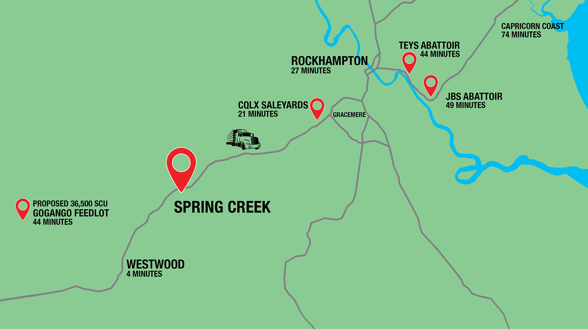 Spring Creek is ideally situated beside the Capricorn Highway around 40 kilometres west of the beef capital city of Rockhampton, and just five kilometres from the community of Westwood with a primary school.